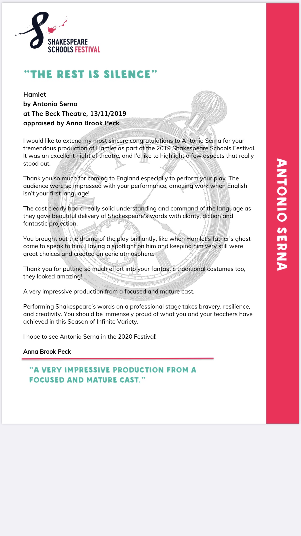 Tras la actuación, recibimos las felicitaciones del público inglés por nuestra dicción, puesta en escena, seguridad interpretativa, proyección de voz, dramatismo, música y, sobre todo, por atrevernos a interpretar a Shakespeare no siendo el inglés nuestra lengua vernácula. Fue una tarde de muchísimas emociones.