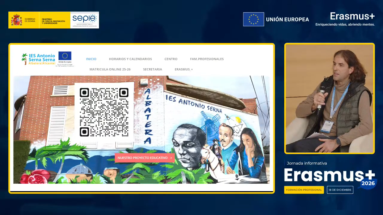 En el marco de la jornada, el IES Antonio Serna tuvo una participación destacada a través de Javier Galiana, coordinador Erasmus+ del centro, quien intervino en la mesa redonda “Impulsando la inclusión y la diversidad en proyectos de movilidad KA1” invitado por Cristina Moreno Valderrey, jefa de servicio de KA1 de la Unidad de Formación Profesional del SEPIE.