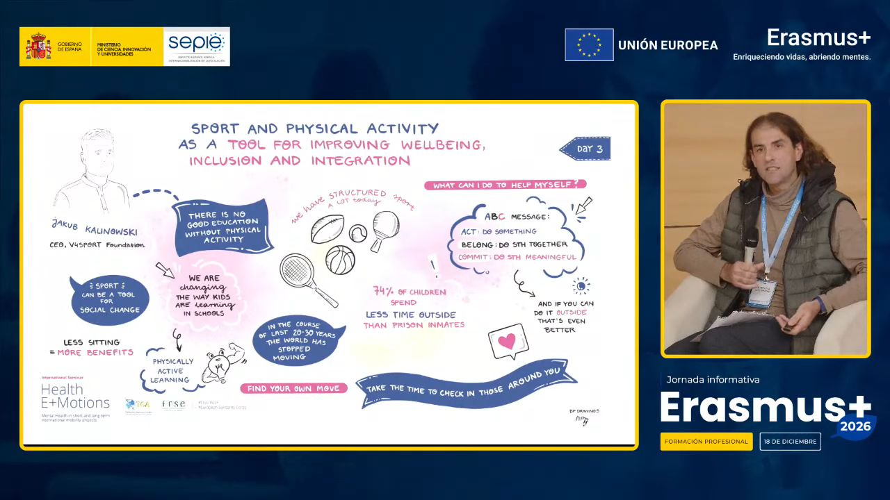 En ella, Javier presentó su centro y puso en valor los logros alcanzados gracias al trabajo en equipo ("Erasmus Team"), subrayando el impacto positivo del programa Erasmus+ en el desarrollo personal y profesional del alumnado y del profesorado, así como en el fortalecimiento de la dimensión europea del instituto. Asimismo, destacó los conocimientos adquiridos en materia de salud mental durante su participación en la Actividad de Formación y Cooperación (TCA) “Health E+motions”, celebrada en Varsovia en octubre de 2024.