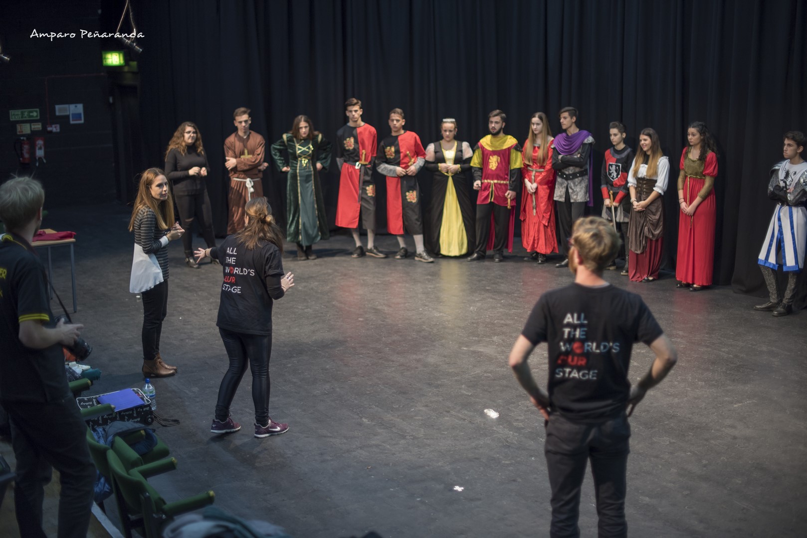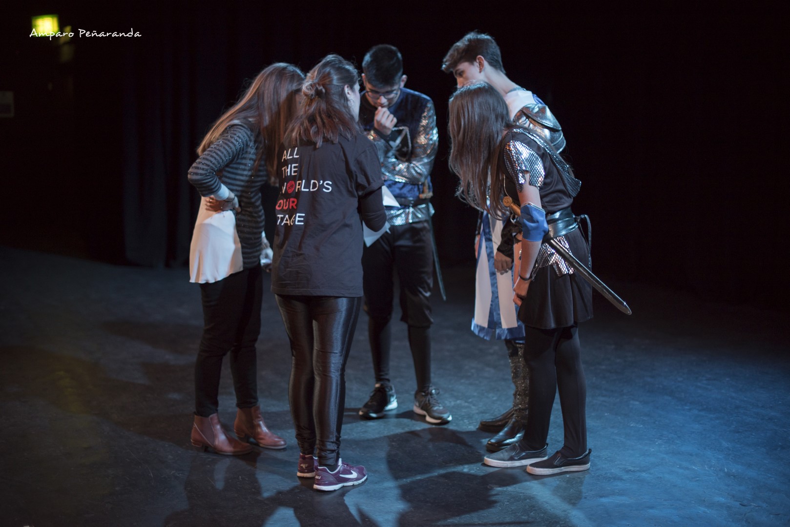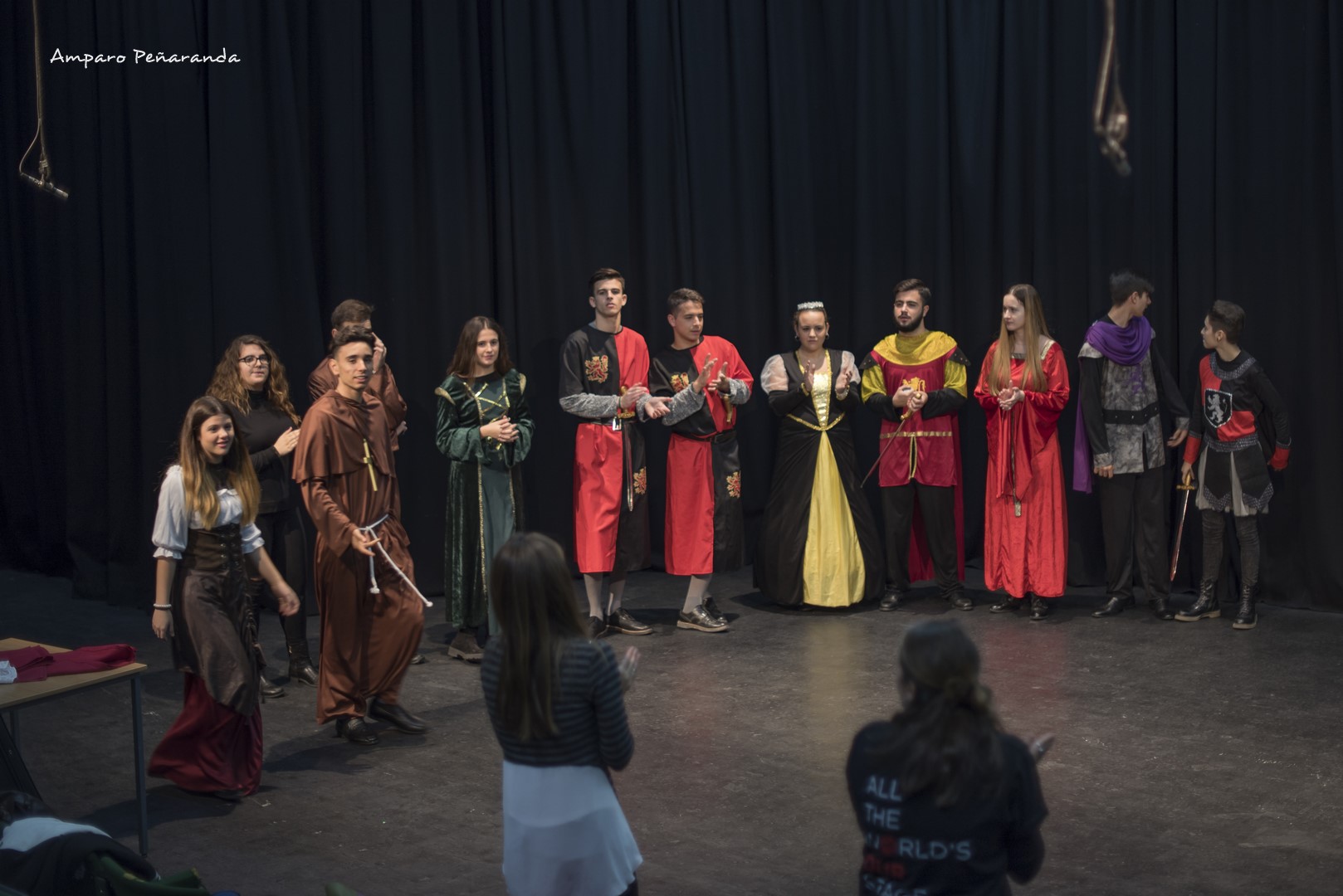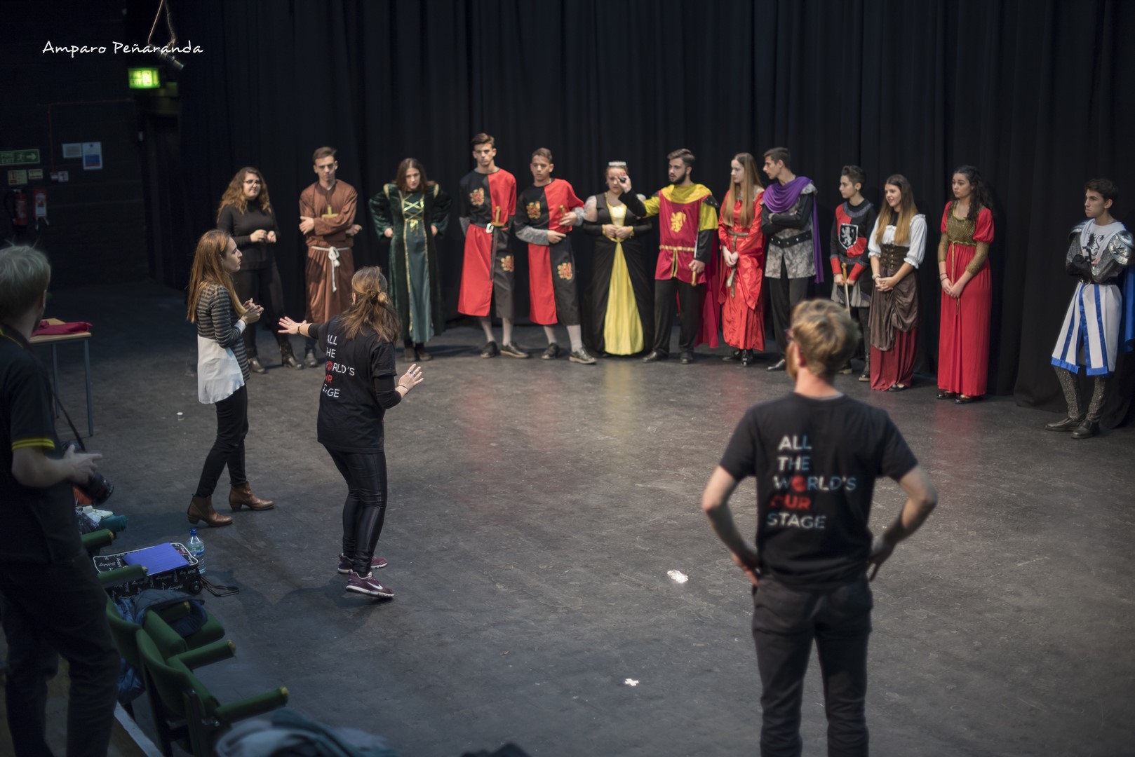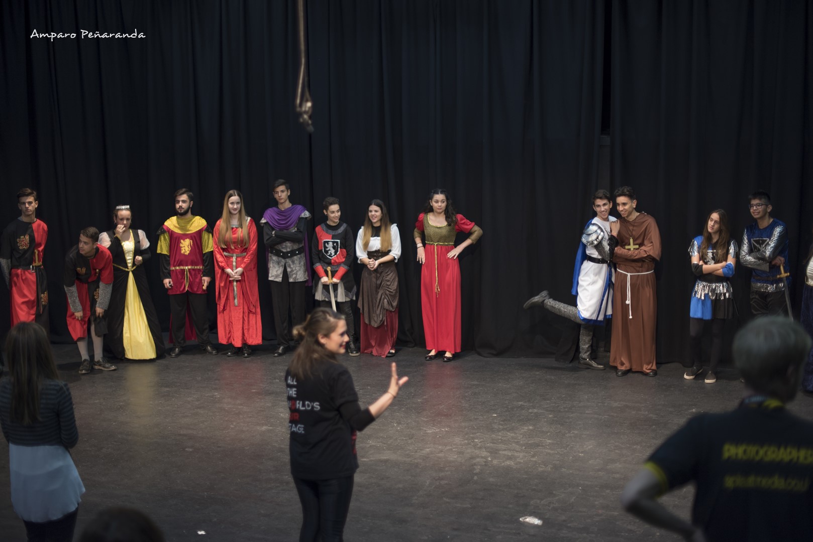 El ansiado día 9, tras los ensayos técnico y artístico de la mañana y el calentamiento de la tarde junto con el resto de alumnos participantes, llegó el momento de la verdad. Los alumnos del IES Antonio Serna lo dieron todo en su representación y el ambiente que se respiraba era verdaderamente mágico. Las actuaciones a nuestras espaldas y la seriedad de la ocasión nos permitieron solventar los pequeños errores que podían ir surgiendo, y, sobre todo, pudimos disfrutar de cada instante, de cada momento, de cada una de las frases que se iban diciendo, de las miradas, de los gestos, de los aplausos y de la complicidad de un público totalmente entregado. Labor realizada y sueño más que cumplido para todos y cada uno de nosotros. Tras acabar nuestra actuación, disfrutamos de las maravillosas actuaciones de los compañeros de la William Ellis School de Londres, con quienes compartimos cartel y que presentaron dos obras distintas, Macbeth y Henry V. Finalmente, subimos todos de nuevo al escenario, y recibimos halagos por parte de la organización y del público asistente, destacando el bonito vestuario, la soltura y entrega de nuestros jóvenes actores, las preciosas piezas musicales en directo, y la valentía por habernos atrevido con un texto tan difícil.