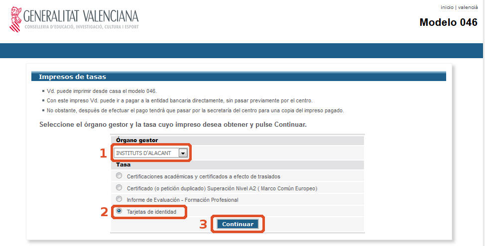 1) Seleccionar como organo gestor "INSTITUTS D'ALACANT"