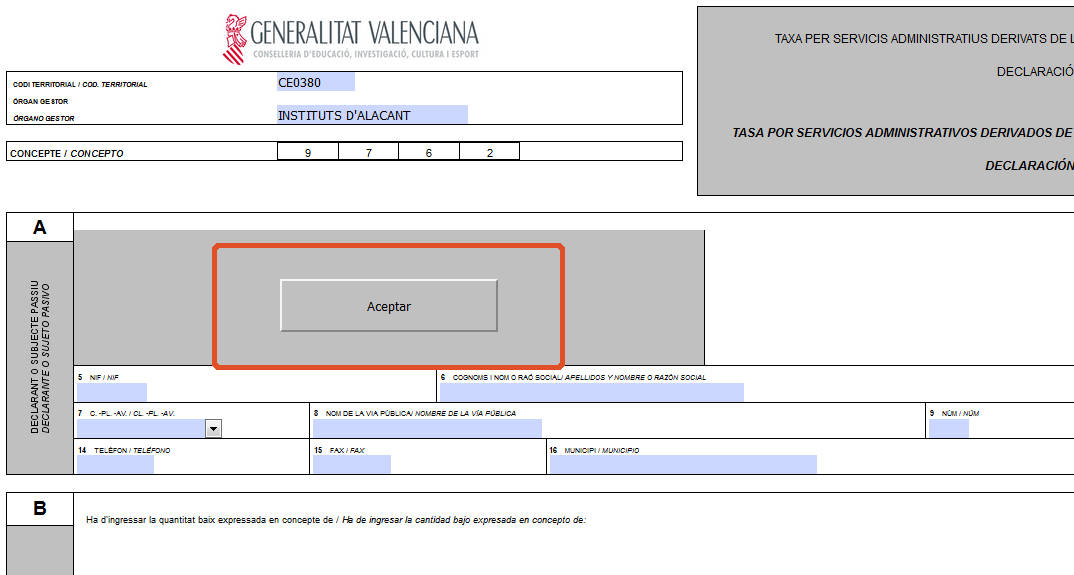 7) Para que se genere el código de barras, se debe pulsar el botón ACEPTAR que hay en la parte superior del formulario. A continuación, imprimiremos la carta de pago. Se imprimirán 3 copias que debemos llevar a la oficina bancaria donde se realice el pago.