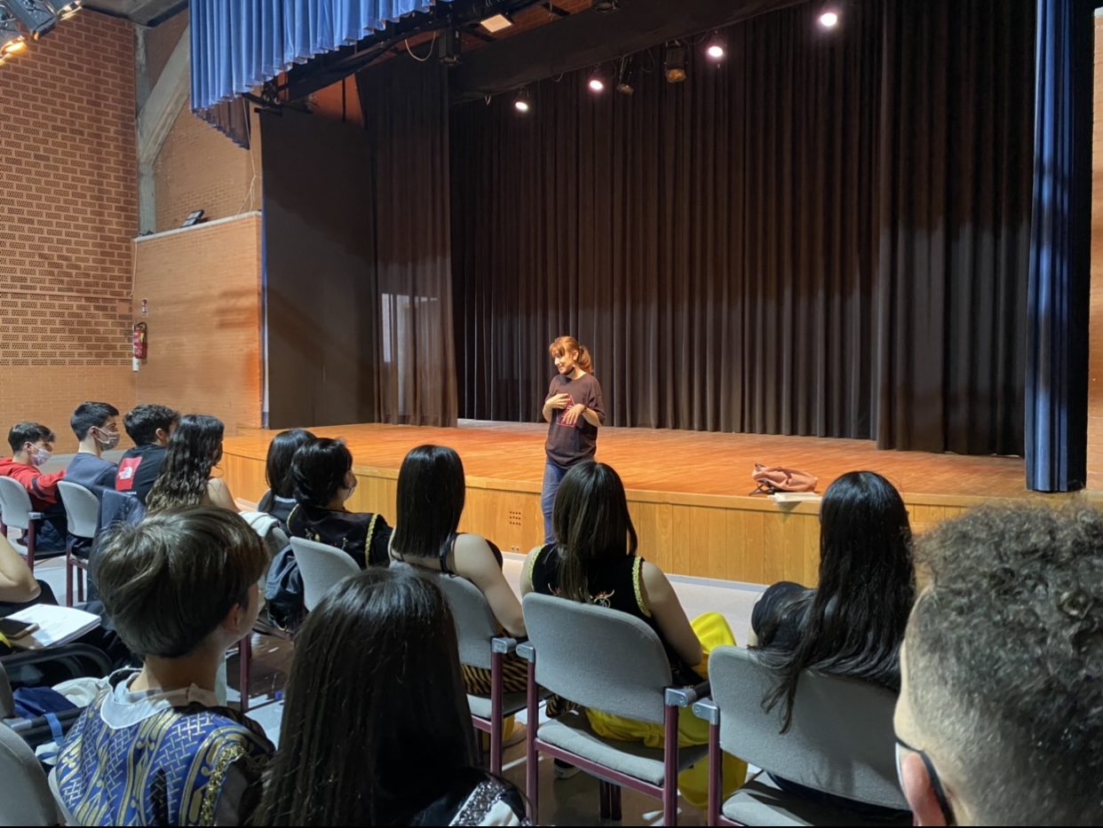 Esta mañana, los alumnos y alumnas de Macbeth, acompañados de sus profesoras Helia Bas y Eva Menargues, han tenido la oportunidad única de disfrutar de una auténtica master class sobre teatro en general y sobre la voz en particular por parte de la albaterense residente en Madrid Begoña Frutos Fuentes, doctora en en artes escénicas y fundamentos del habla escénica y profesora de las asignaturas de Técnica Vocal, Expresión Oral y de Verso Dramático en la RESAD (Real Escuela Superior de Arte Dramático).