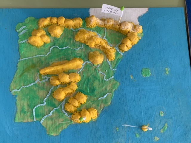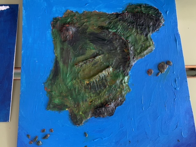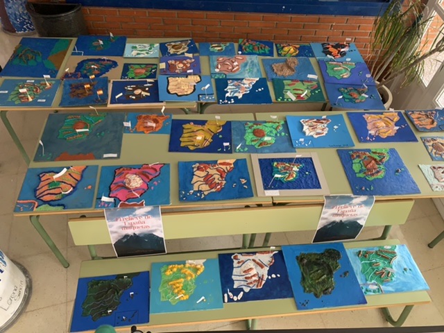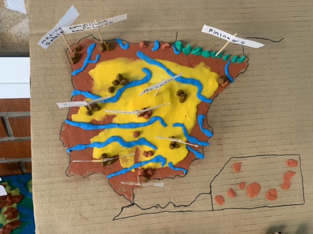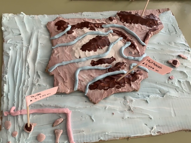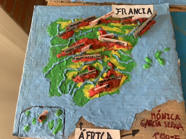 Los alumnos y alumnas de 1º de ESO están ayudándose de la plastilina y su habilidad para conocer el relieve y los ríos de España. Aquí tenemos una amplia muestra de los mapas físicos creados por ellos.