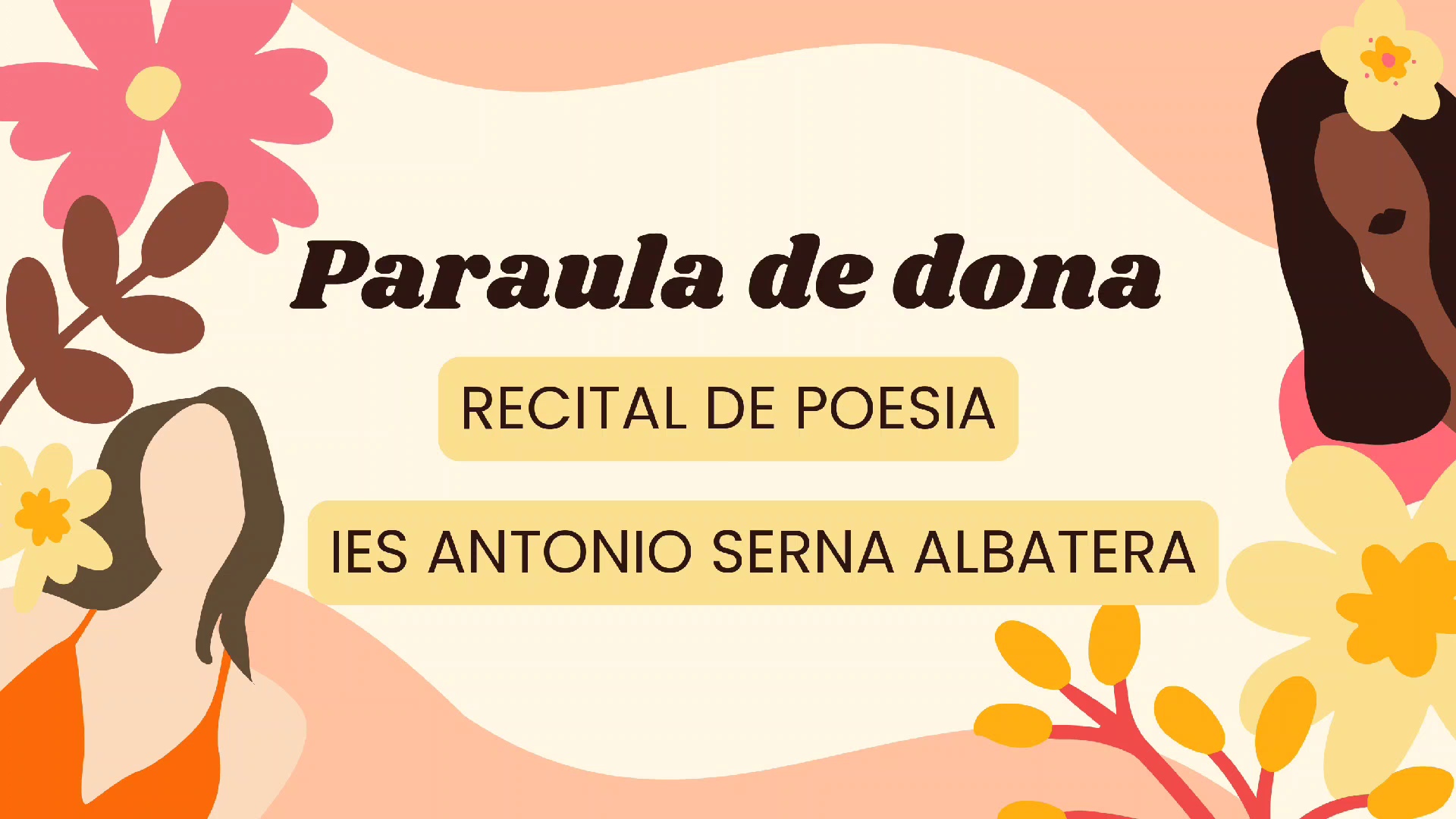 El passat divendres 10 de març, dins de la setmana en la qual hem commemorat el Dia de la Dona a l’IES Antonio Serna, hem tingut el plaer de celebrar el primer recital de poesia organitzat pel Departament de Valencià. L’activitat portava el títol de “Paraula de dona” i tenia per objectiu donar visibilitat a la creació literària femenina. Vam tindre el plaer d’escoltar a dinou rapsodes, xics i xiques de diferents nivells d’ESO i Batxiller. Els poemes seleccionats es van dividir en quatre blocs: la dona i el feminisme, la dona i l’amor, la dona i la vida, i la dona i la paraula. Per acabar d’arrodonir l’acte, el professor Marcos Aguilar i quatre membres de la banda del centre, van acompanyar les recitacions amb peces instrumentals que van aconseguir donar-li a l’acte tota la força i sentiment necessaris per a portar la “paraula de dona” a un altre nivell. El nombrós públic, principalment alumnes de 4t d’ESO, va gaudir de l’acte a l’entrada de l’edifici principal del centre, especialment decorat amb els magnífics treballs realitzats, també en commemoració del Dia de la Dona, per l’àmbit sociolingüístic (“Dones de bandera” i “Las mil y una noches” ...) i les produccions del Departament d’Economia “I concurso de cortos por la igualdad”.
