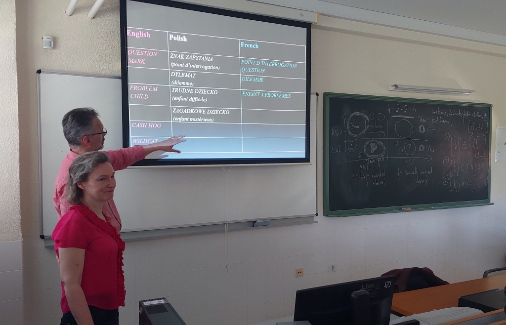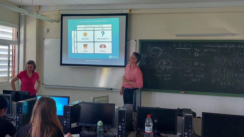 Los doctores ofrecieron a nuestros alumnos de Primero de Grado Superior de Administración y Finanzas, tutelados por Eva Menargues y a alumnos de Segundo de Bachillerato tutelados por Rosario Bertomeu, clases para sensibilizar a los alumnos sobre la terminología empresarial resaltando las similitudes y diferencias en la terminología comercial figurativa en diferentes idiomas/culturas (español, inglés, francés, polaco).