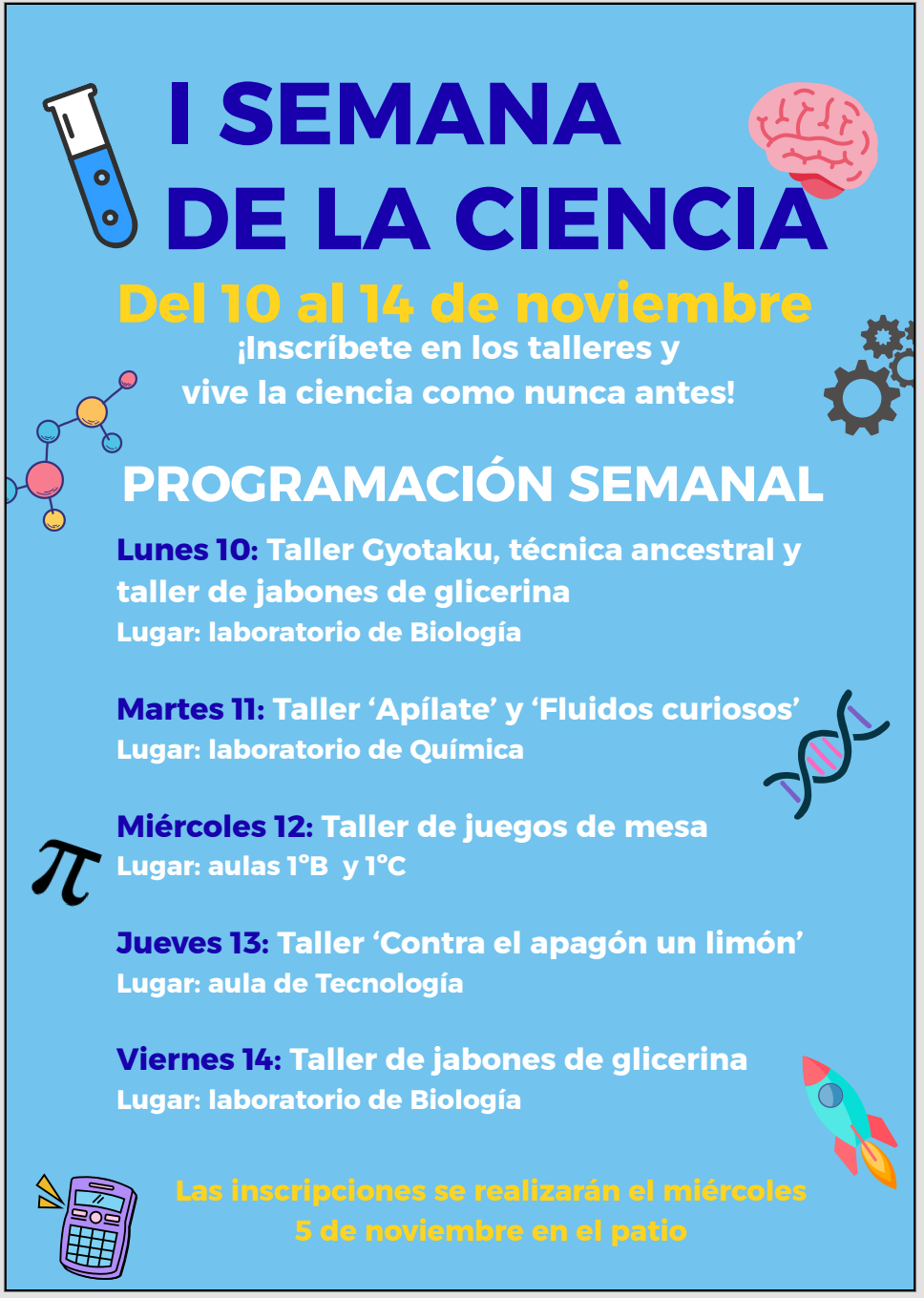 El miércoles 5 de noviembre, durante el recreo, podrás inscribirte en los talleres de ciencias que se realizarán a lo largo de la semana. ¡No pierdas tu plaza!