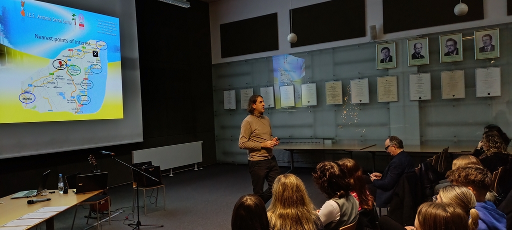 Javi no desaprovechó la oportunidad para promocionar nuestro instituto y nuestra región a dos grupos de alumnos que estudian Filología Hispánica, invitando a los asistentes a visitarnos. Además, Fito Galiana, que en ocasiones acompaña a su hermano en ciertas movilidades, cantó para los alumnos mostrando obras de su autoría así como otras canciones populares del pop español.