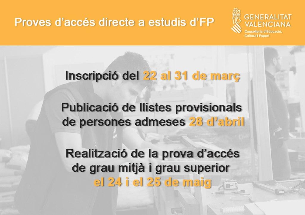 La RESOLUCIÓN de 23 de diciembre de 2020, de la Dirección General de Formación Profesional y Enseñanzas de Régimen Especial, convoca las pruebas de acceso a los ciclos formativos de Formación Profesional.  (DOGV 11/01/2021)