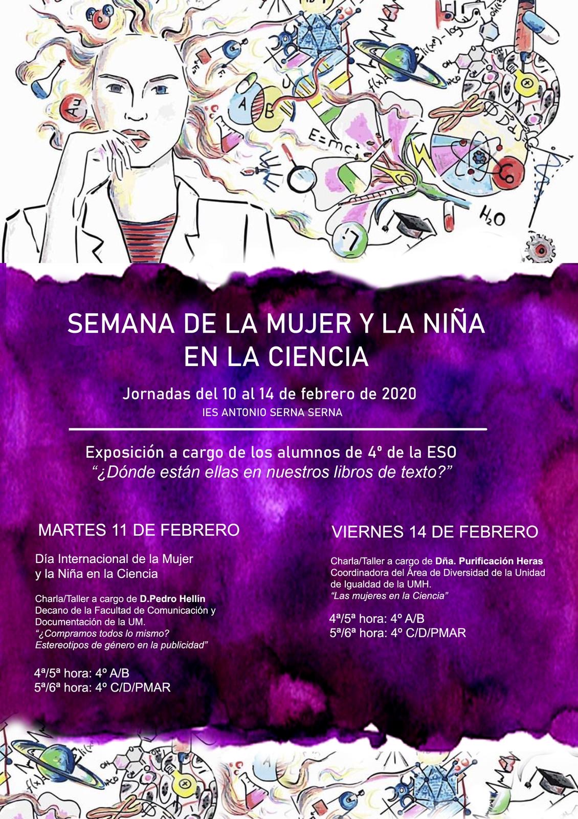 Con motivo del "Día Internacional de la Mujer y la Niña en la Ciencia" que se celebra el 11 de febrero, las mujeres científicas del Claustro de Profesoras del IES Antonio Serna Serna, con la ayuda del Departamento de Orientación, van a llevar a cabo del 10 al 14 de febrero, la Semana de la Mujer y la Niña en la Ciencia. Esta actividad forma parte del Plan de Covivencia e Igualdad del presente curso 2019/2020.
