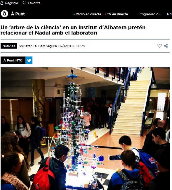 La página web de À Punt ha publicado una noticia relacionada con la instalación del Árbol de la Ciencia que ha decorado el vestíbulo del instituto estos días de Navidad. Este árbol ha sido confeccionado con materiales de laboratorio por los alumnos de Ciencias Aplicadas del PR4.